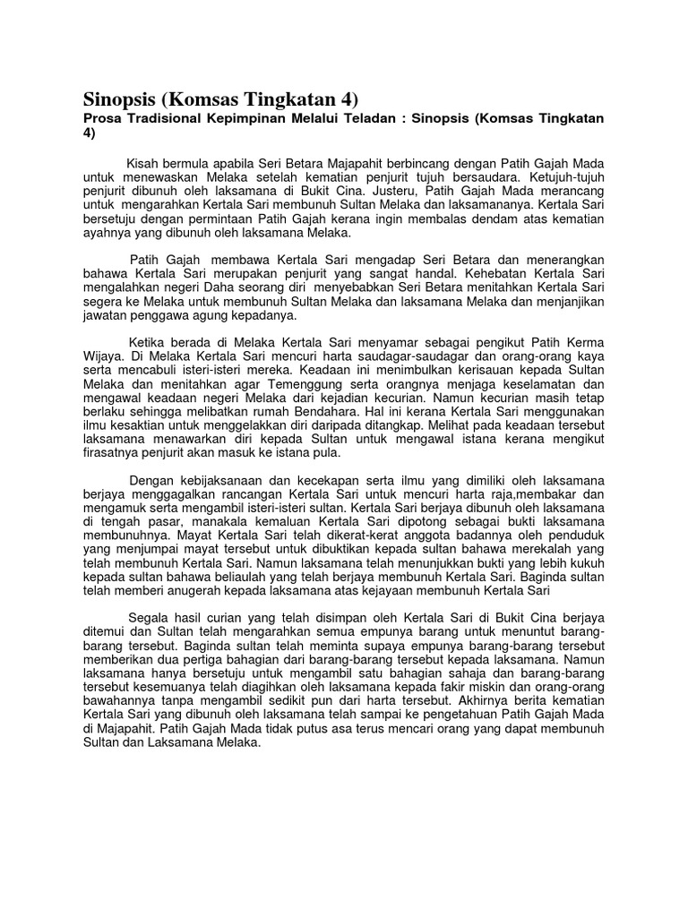 YAP E WEN menerbitkan Kepimpinan Melalui Teladan pada 2020-03-27. Sinopsis Tema Persoalan Watak Perwatakan Latar Tempat Latar Masa Latar Masyarakat Gaya Bahasa Nilai Pengajaran Soalan KBAT Soalan Peperiksaan Skema. Laksamana-Seorang yang berani-Seorang yang pemurah.